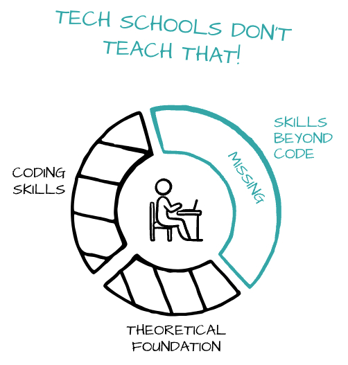 And this lack actually makes sense! These are all things you don't learn in traditional training programs. Universities and training programs make you fit in theoretical or technical basics and they obviously set their focus on coding skills. Even in "leading" tech conferences the number of talks that do not exclusively deal with code and technology is less than 10% (and that is mostly about agile stuff).