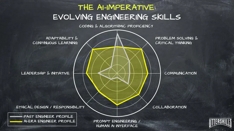 The Evolving Skillset of an Engineer: The radar chart illustrates the shift in core competencies for engineers from the pre-AI era to today’s AI-driven landscape. Where coding once dominated, today’s engineers thrive by balancing technical and human-centric skills.